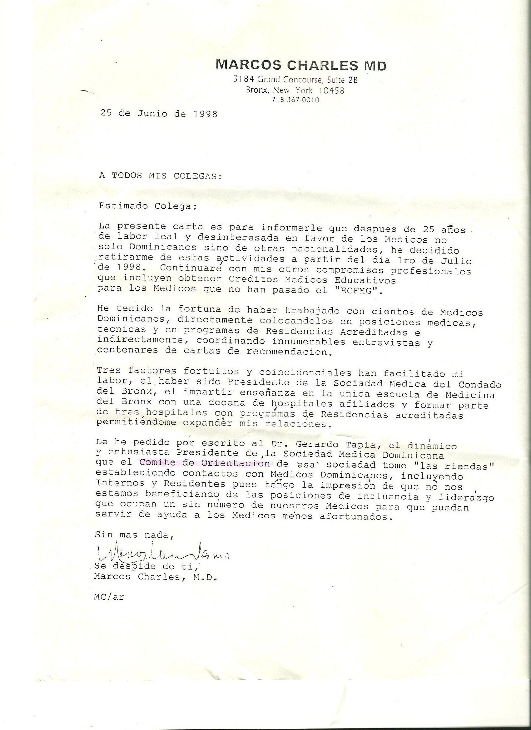 Que demuestra esta carta, ? porque la conservo, esta correspondencia la quiero presentar ante ustedes como un documento testigo fiel, del trabajo realizado por un profesional el cual sacrificó por mucho tiempo su vida privada, su practica profesional, incluyendo el personal, de su oficina, para ponerlo a servicio de los Inmigrantes profesionales de la Salud No solamente Dominicanos si no tambien Latinos, esta carta la considero hoy por hoy como un testamento conciente al Compromiso y la vision de servir como orientador o vehiculo para nuestros Profesionales Medicos en Estados Unidos, usando como base las diversas posiciones las cuales el ocupo y le sirvio como instrumento para realizar su labor, pero quizas el legado que el Dr.Charles, nos trato de hecer ver o de estimular que hicieramos, y es que aprovechemos nuestros posiciones no importa el rango para seguir contribuyendo a que nuestros inmigrantes medicos logren sus sueños de una manera mas rapida en este Pais de USA, La carta envia un mensaje para la nueva generacion de Medicos la cual esta escalando y obteniendo posiciones en este pais, es devolver en parte a los Nuevos recien llegados, como lo hizo el Dr.Marcos Charles , por mucho tiempo.