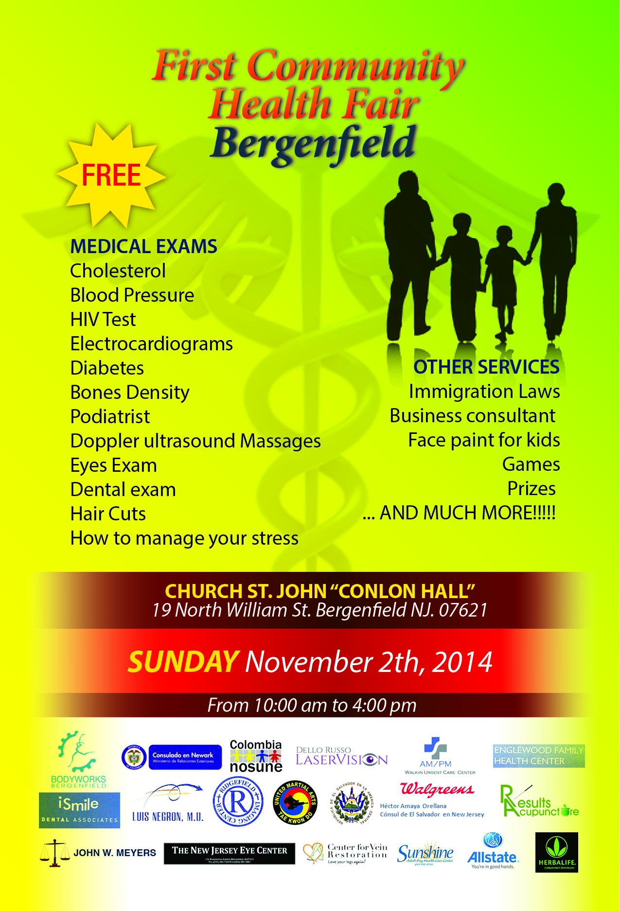 Noviembre, 2, Sunday 2014, Feria anual Comunitaria de la Salud, Conlon Hall, St.Jhon School, 19 North ,Williams St, Bergenfield, NJ, 07621. 1-888-277-1288. 732-277-9640. resti1@aol.com
