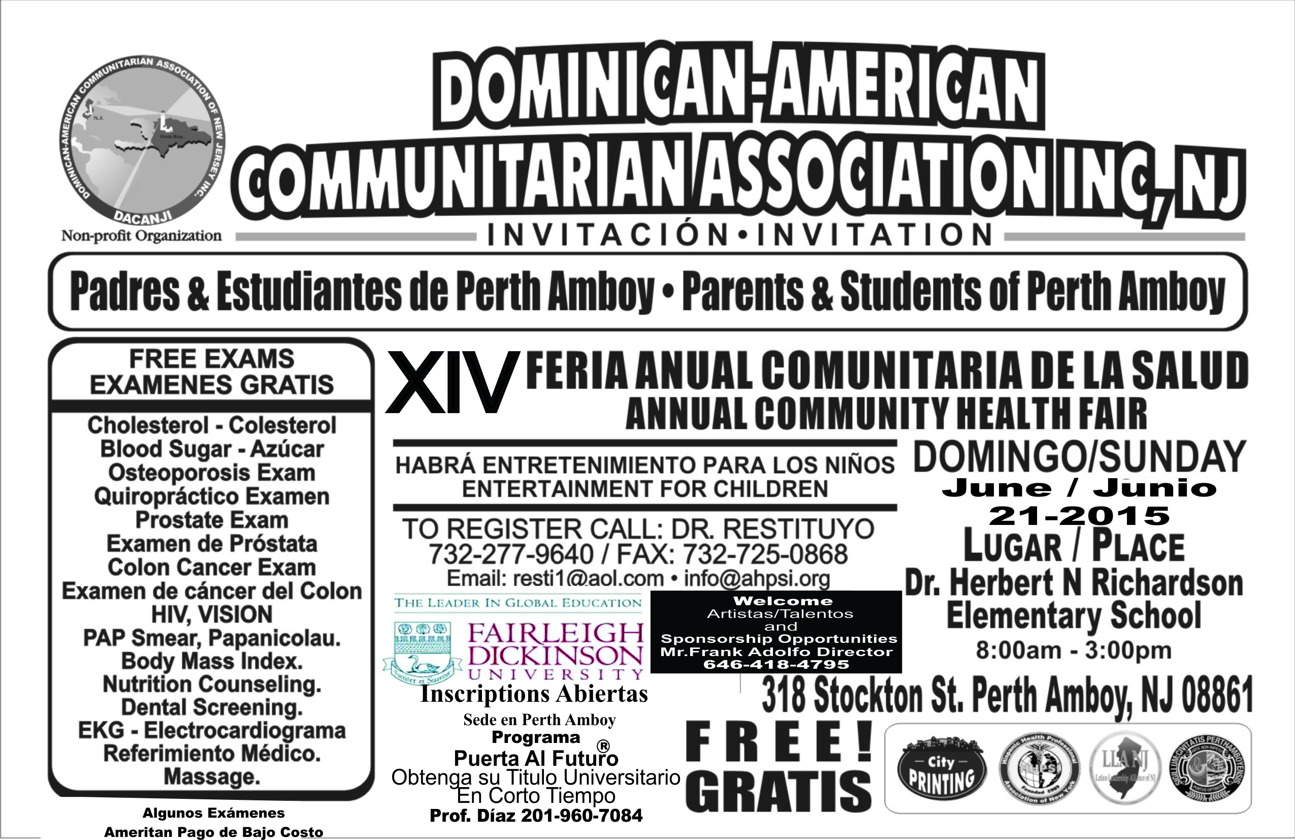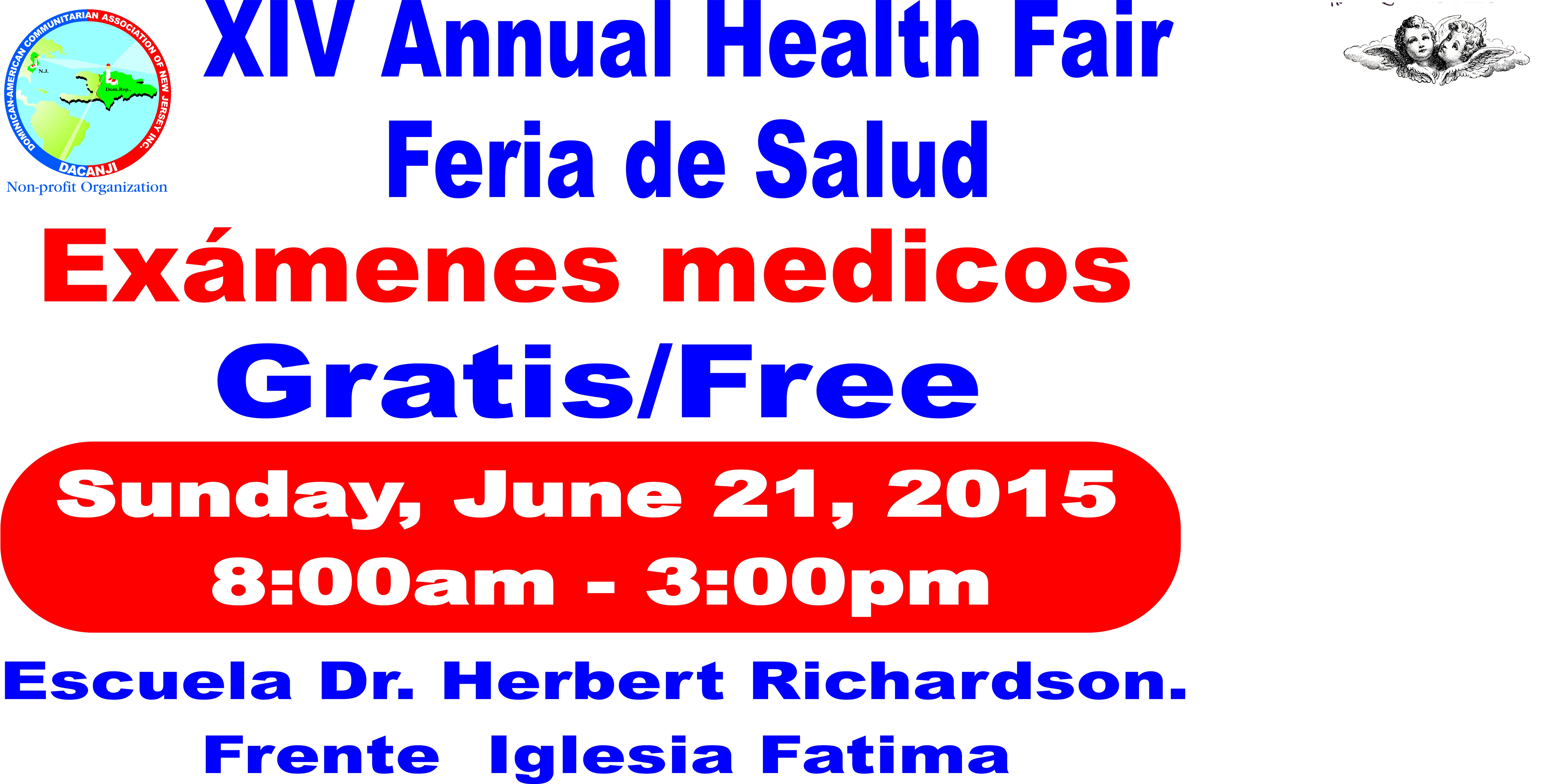 DACANJI invite parents & students of Perth Amboy, to participate in the fourteenth annual Health Fair, «Decide to be healthy», to be held in Richardson Dr.Herbert School, located at 318 Stockton St, Perth Amboy, New Jersey , 08861,Available various medical exams, dental exams, prostate exams, lectures, workshops, Dominican consulate Movil, passport renewal, issuance of the new Dominican identification, music, entertainment for all the family, gifts, free of Cost free surprises will be offered , Time 8: 00- 3:00 pm, Sunday, June 21, 2015, More details call: 1-888-277-1288. 732-