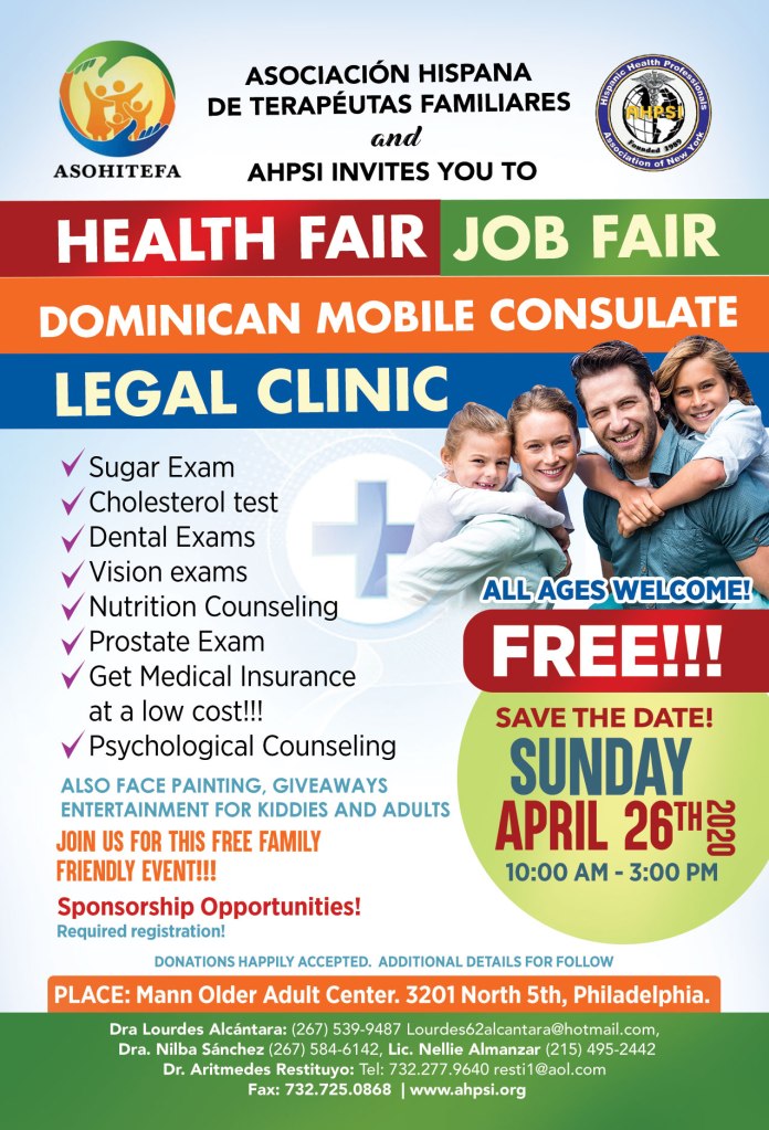 Ahpsi, Hispanic Association of Health Professionals, Inc NY, invites its members to register to offer services at this II annual health fair, to be held in the city of Philadelphia, Sunday, April 26, 2020, 10 am-3pm , Located in the Mann Older Adult center, 3201 of North 5th St, Philadelphia, we will have transportation available, from New York, you must register in advance, in addition this health fair includes breakfast, lunch, coffee break, certificate of participation, for The medical assistants will be granted credits, valid for the renewal of your certificate, especially this great health fair will have for you a post-fair reception, «not everything is work», Ahpsi in collaboration with Asohitefa, saving lives.