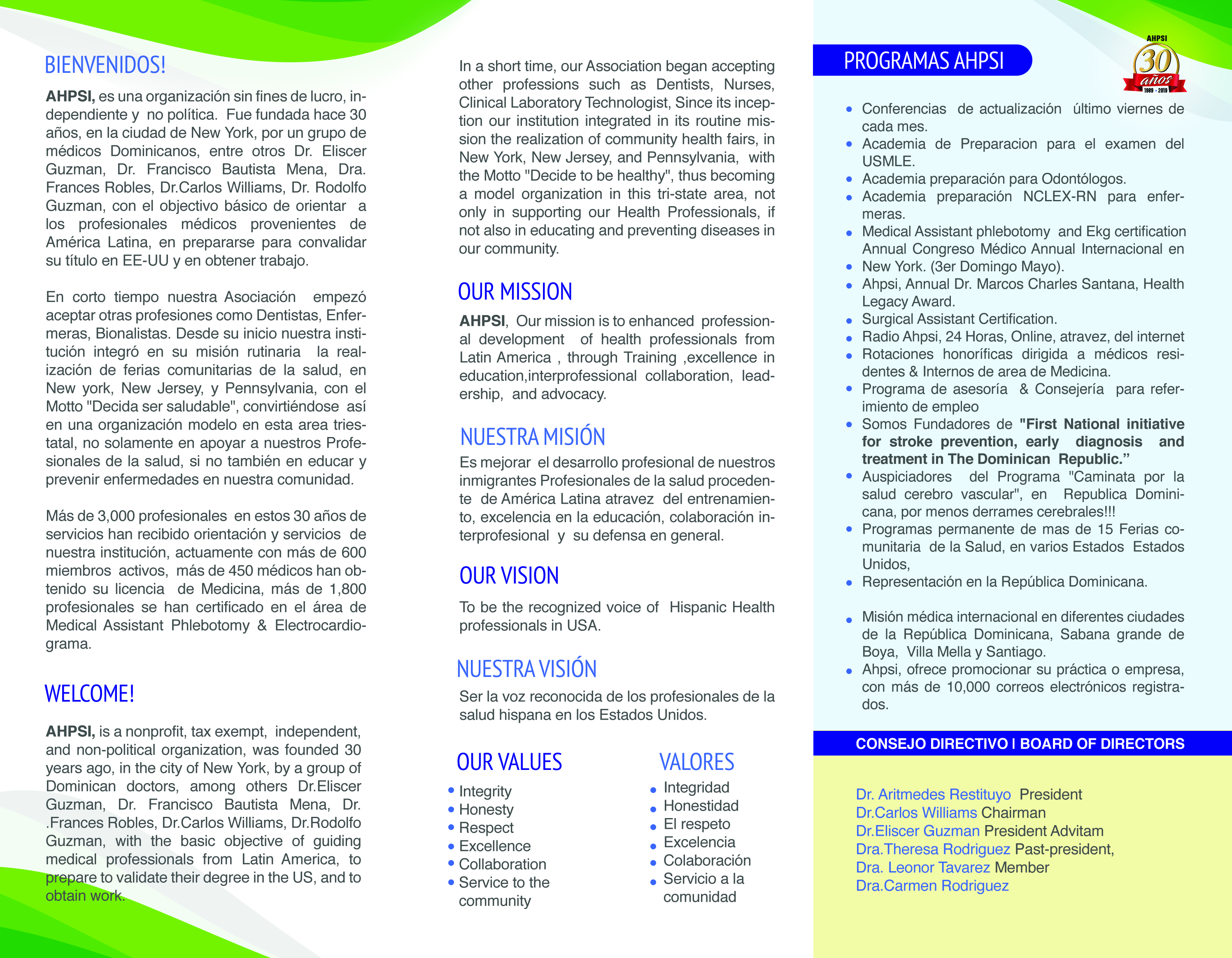 Cada uno de estos 6 grandes valores de nuestra Asociacion Hispana de Profesionales de la salud, representan todo un mundo, pero ha sido nuestra meta apegarnos a estos valores, tratamos de cumplirlo hasta repondiendo llamadas telefonicas, correos electronicos, y acudiendo a ofrecer servicios en nuestra comunidad, estos valores han estado presente, gracias nuestros fundadores, y a nuestros leales miembros en estos 30 años