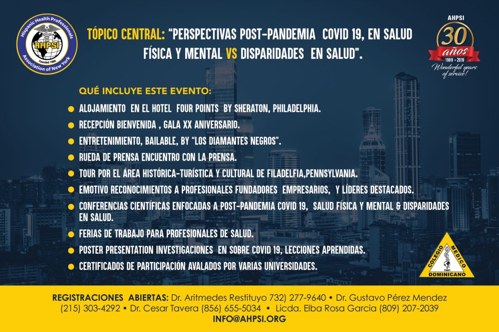 El colegio médico Dominicano, filial Filadelfia, mejor conocido como filial valle Delaware,en conjunto con la asociación Hispana de profesionales de la salud, invitan los profesionales médicos, psicologos, enfermeras, laboratoristas, a participar en el XX congreso medico anual internacional a celebrarse en la ciudad de Filadelfia Pennsylvania, Octubre 29, 30, 2022.