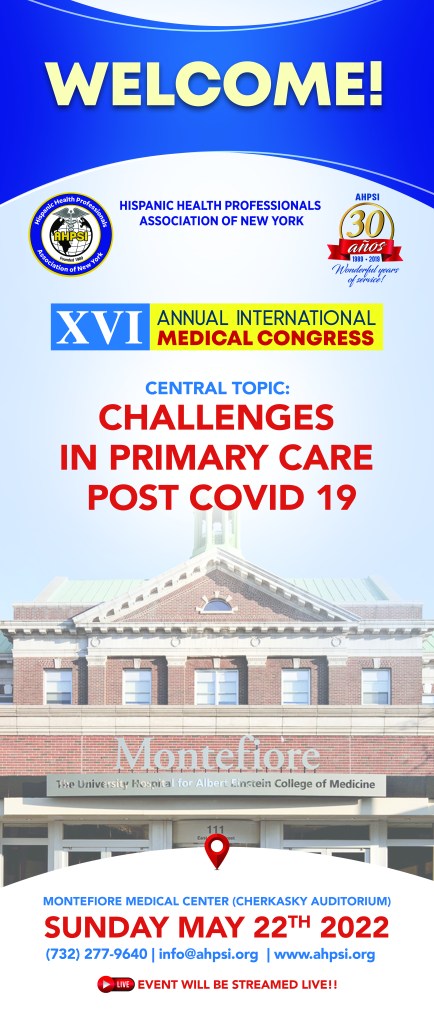 Nuestra asociación hispana de profesionales de la salud, Inc NY,over 33 years of service, se siente contenta en poder invitar a sus miembros profesionales de la salud, por primera vez después de la pandemia,del COVID 19, a participar en el XVI congreso médico multidisciplinario anual, a celebrarse el Domingo 22 de mayo, 2022, hora 8am-4pm, lugar auditorium Cherkasky, del Montefiore hospital, del Bronx NY.