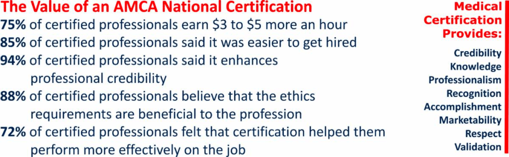 Arriba, encontrarás 8 benéficos en certificarse, area como asistente medico, flebotomia, electrocardiograma, asistente terapia fisica, asistente dental.