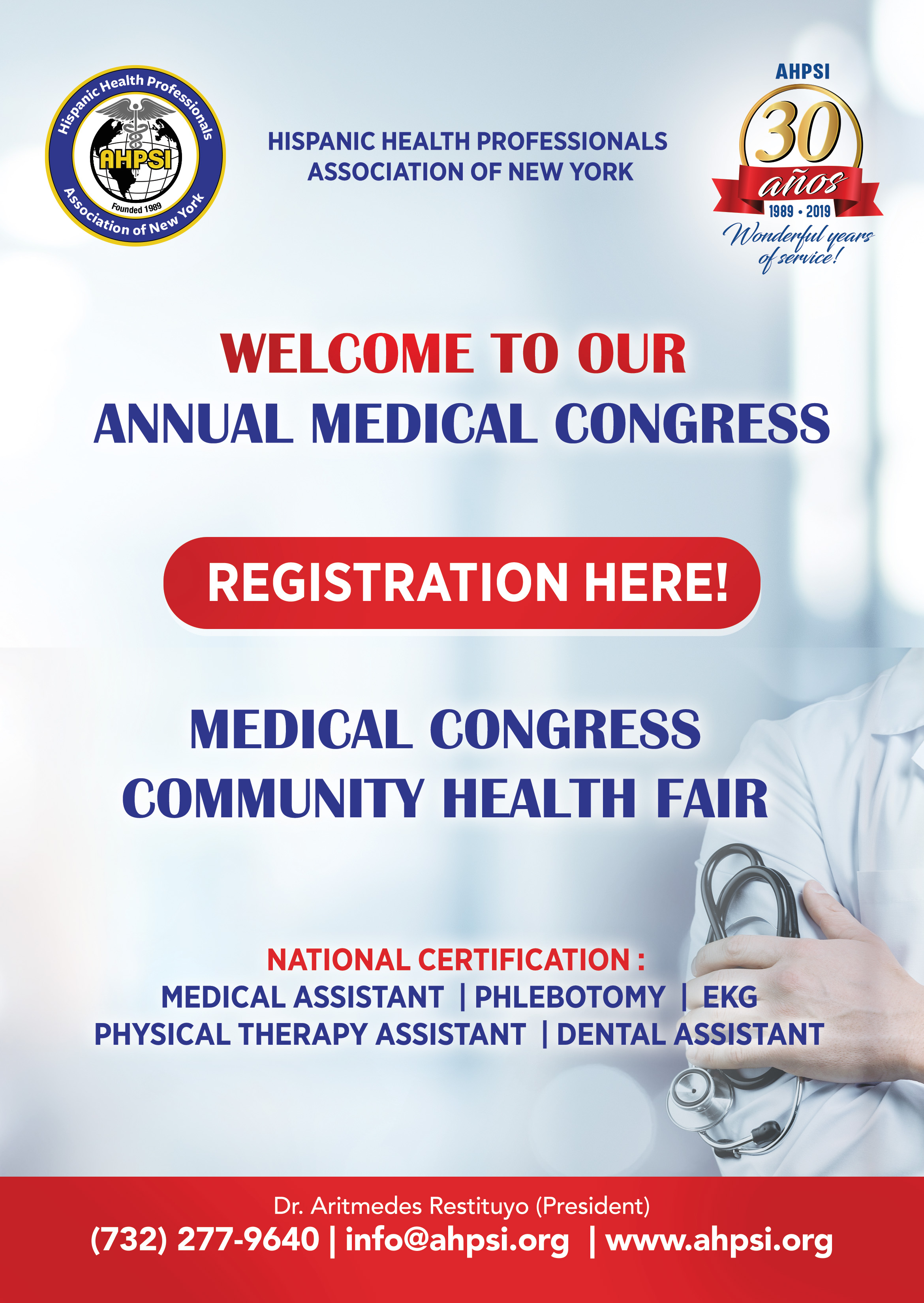 Our Hispanic association of health professionals, inc, New York invites its members, friends, media, and collaborators to participate in the XVI annual medical congress as every year, on the third Sunday of May, we celebrate this event, in this The occasion will take place on Sunday, May 22, in the auditorium, place: Montefiore Medical Center, Cherkasky auditorium, 111 East 210th Street (Moses Division Hospital), Bronx, New York 10467.