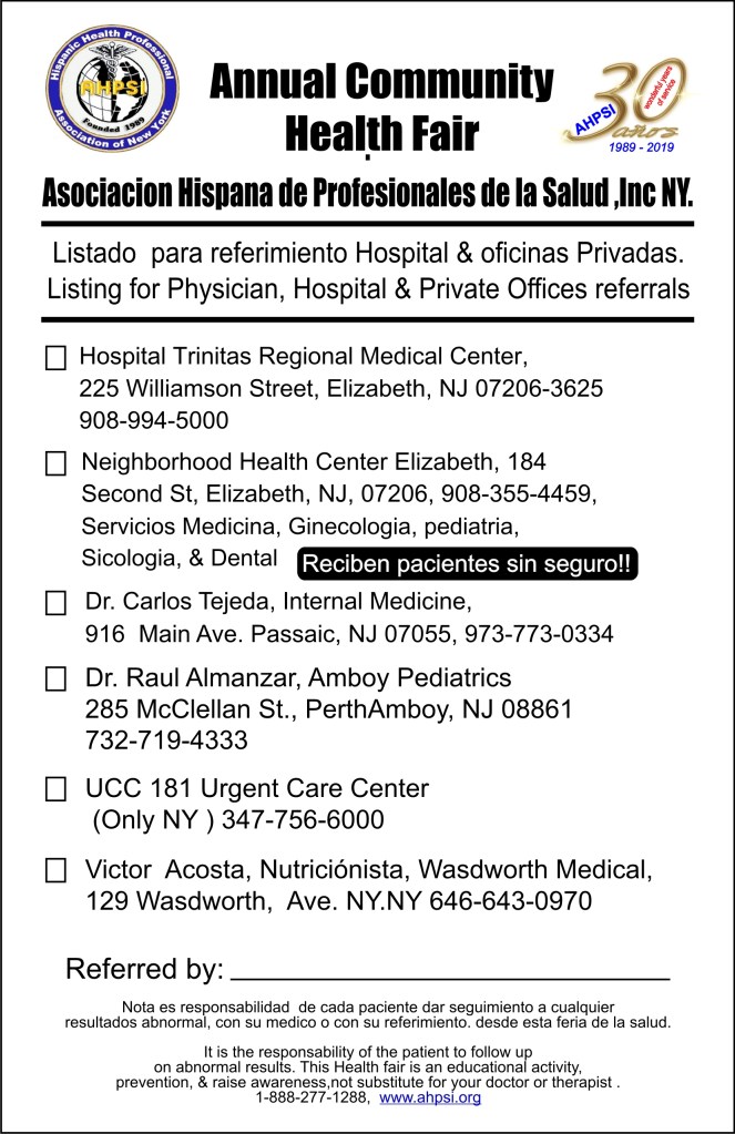 Aquí un ejemplo de formulario usado con copia amarillo para referir sus pacientes., tomado como ejemplo de la feria comunitaria de la salud, de Elizabeth New Jersey.