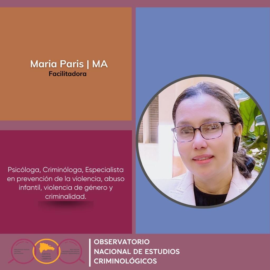 La licenciada María París, con una licenciatura en psicología, obtenida en la Universidad de la Tercera Edad (UTE) en la República Dominicana.