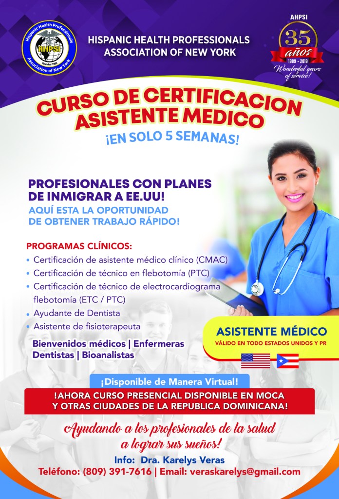 La Asociación Hispana de Profesionales de la Salud, Inc. de Nueva York se complace en anunciar nuevos programas acelerados de certificación nacional en áreas como asistente médico, flebotomía, electrocardiograma, técnico de cuidados al paciente, asistente dental y asistente de terapia física. Estos programas, avalados a nivel nacional en Estados Unidos, ahora están disponibles de forma presencial y acelerada en la República Dominicana.