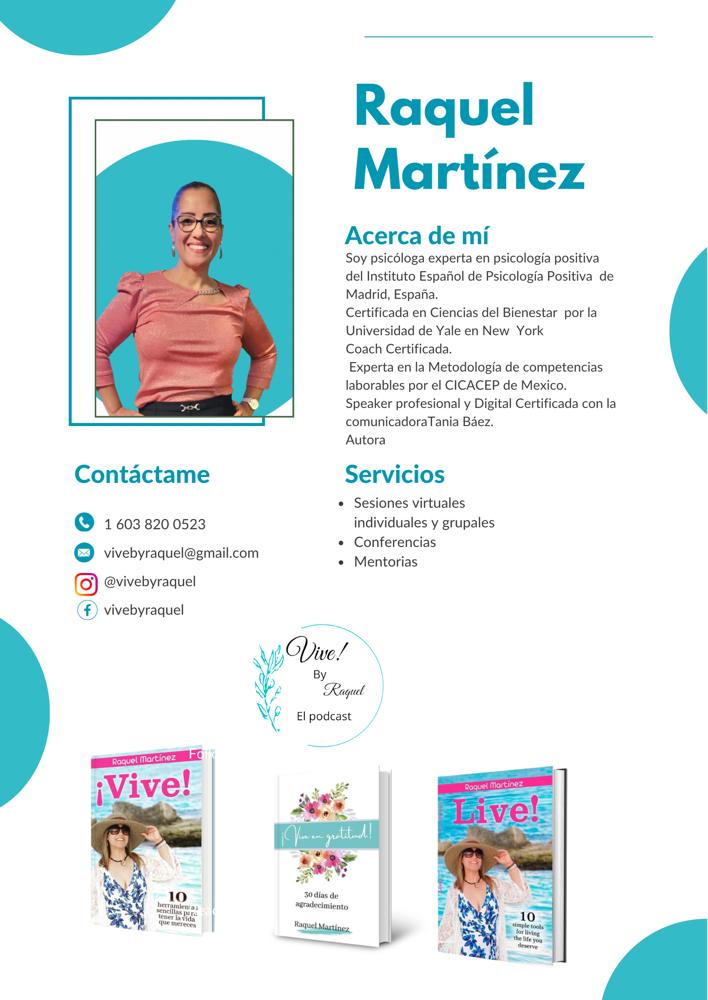 Semblanza: Raquel Martínez ,dominicana Lic en Psicología egresada de la Universidad Tecnológica de Santiago UTESA Certificada en ciencias del bienestar por la Universidad de Yale en New York Certificada en la Metodología de competencias laborales del CICACEP en la Ciudad de México, México Experta en psicología positiva certificada por el Instituto Español de Psicología Positiva de Madrid, España Certificada como speaker profesional y digital por la Mentora y entrenadora de Speakers Tania Baez de la República Dominicana Autora de los best sellers ¡Vive en gratitud! Y ¡Vive! 10 herramientas sencillas para lograr la vida que mereces Y pronto lanzará su más reciente libro “Los monstruos en mi armario”
