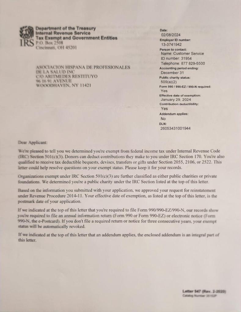 La Asociación Hispana de Profesionales de la Salud, Inc. (AHPSI) se enorgullece de haber obtenido la designación 501(c)(3) del Servicio de Impuestos Internos (IRS). Este estatus como organización exenta de impuestos es esencial para la capacidad de AHPSI de cumplir con su misión de servir a la comunidad hispana en el área de la salud.