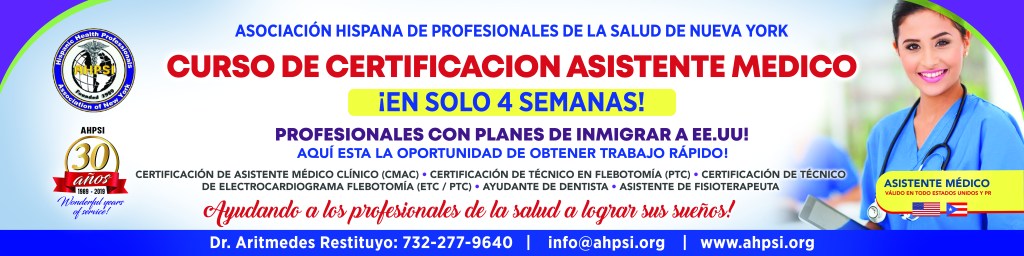 Bienvenidos a nuestro blog de la Asociación Hispana de Profesionales de la Salud fundada en el año 1989 en Nueva York, la cuál ofrece servicios a nuestros inmigrantes profesionales de la salud. Médicos, enfermeras, odontólogos, psicólogos, trabajadores sociales, veterinarios y estudiantes en el área de la salud residentes en la zona de Nueva York y New Jersey ,Pennsyvania, Conneticut, MA, entre otros estados. puede visitra nuestra pagina web :www.ahpsi.org