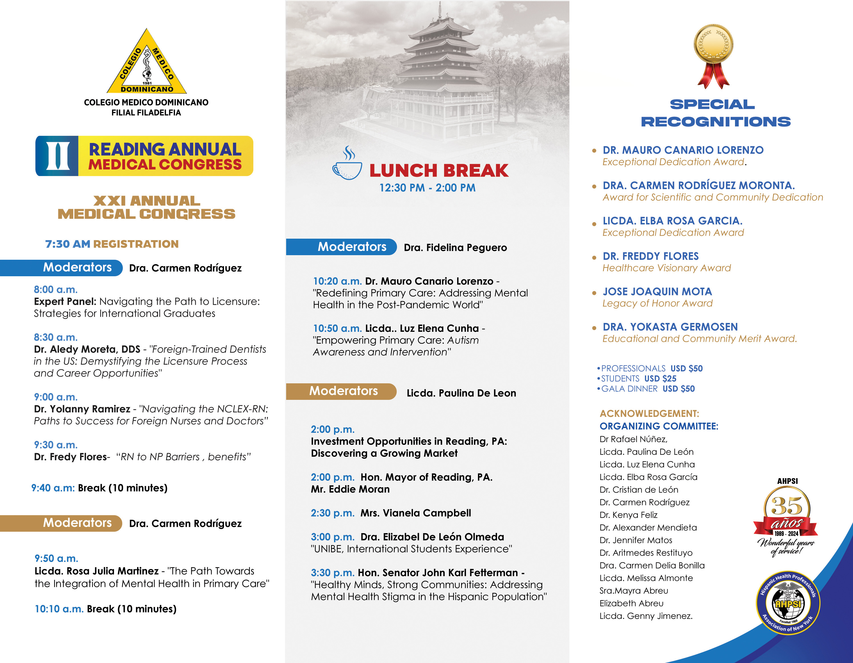 Es con gran placer y honor que les damos la más cordial bienvenida al XXI Congreso Médico Anual Internacional, que se celebrará el domingo 31 de marzo en la ciudad de Reading, Pennsylvania. Este año, nuestro simposio médico se centra en un tema de vital importancia: «La integración de la salud mental en la atención primaria».