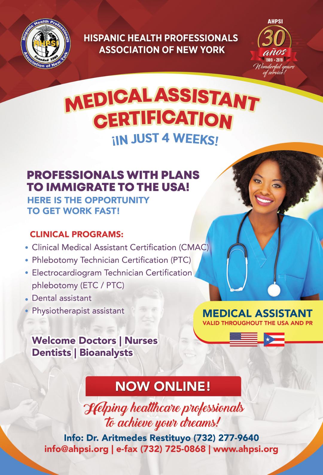 Usted ahora puede certificarse con nosotros en 7 áreas básicas, de manera acelerada, virtual, en espanol, en estas áreas: medical assistant, Patient care technician, Phlebotomy, EKG, asistente dental asistente de terapia fisica, health care Technician.
