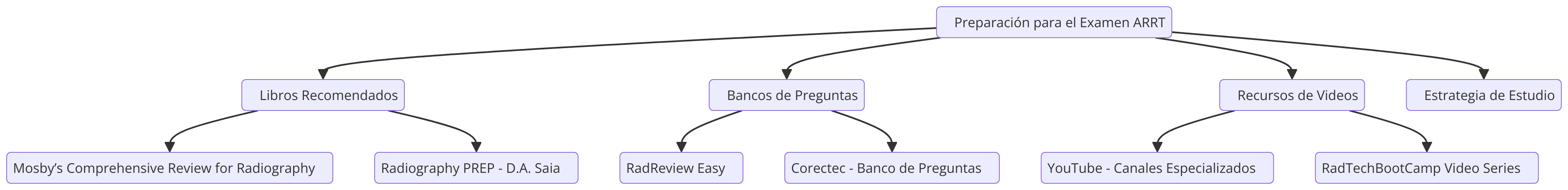 Aquí tienes tres recursos diferentes para preparar el **Examen de Registro para Técnicos Radiológicos (ARRT, por sus siglas en inglés)**, que es el examen requerido para obtener la licencia como técnico radiólogo en Estados Unidos. Los recursos están organizados en libros, bancos de preguntas y videos: