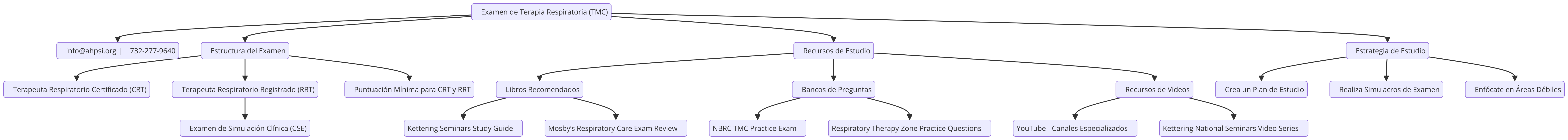 Aquí tienes tres recursos diferentes para preparar el **Examen de Terapia Respiratoria (TMC, por sus siglas en inglés)**, que es el examen requerido para obtener la licencia como terapeuta respiratorio en Estados Unidos. Los recursos están organizados en libros, bancos de preguntas y videos: