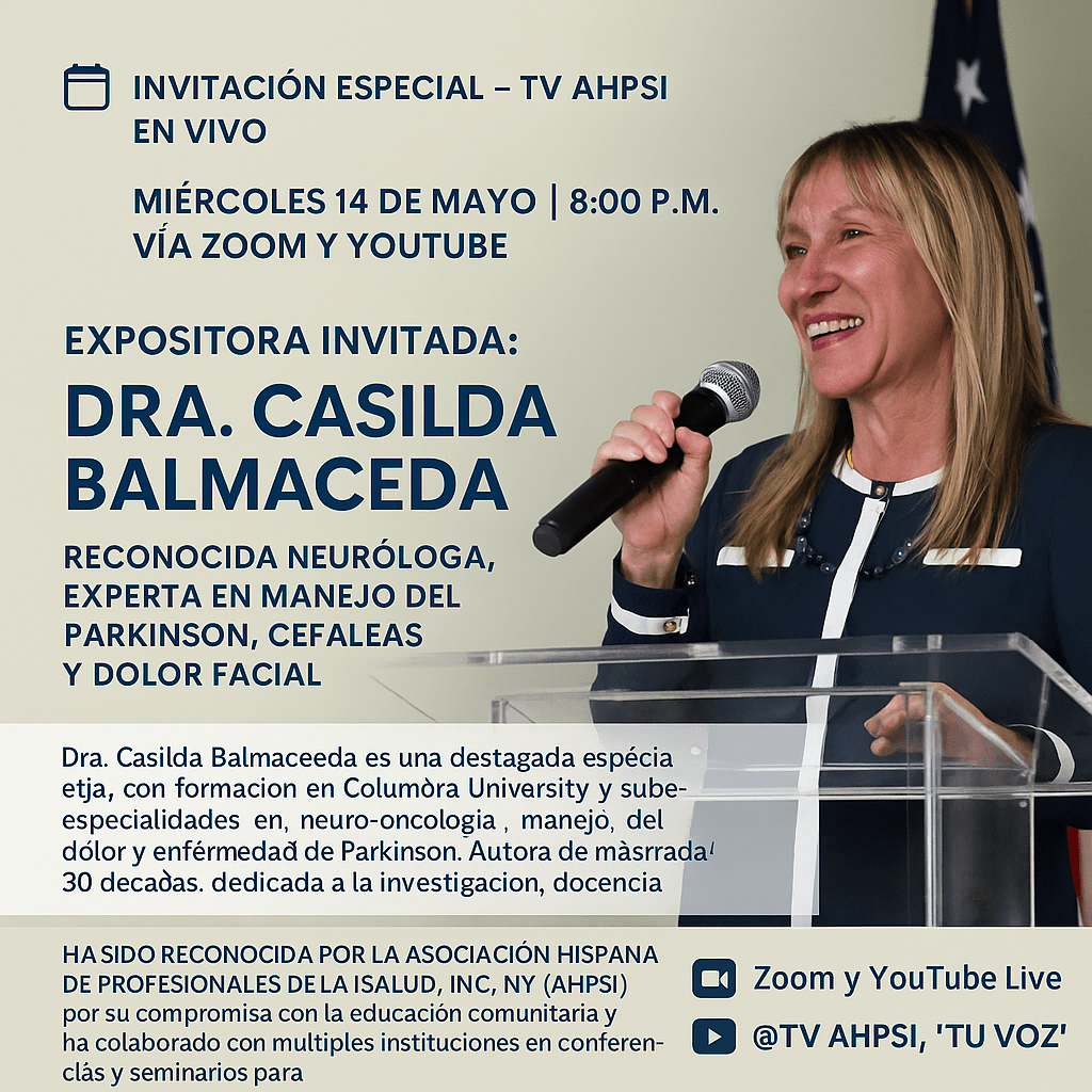 La Dra. Casilda Balmaceda, reconocida neuróloga y conferencista internacional, será nuestra expositora invitada en TV AHPSI este miércoles 14 de mayo a las 8:00 p.m., en transmisión en vivo por Zoom y YouTube.