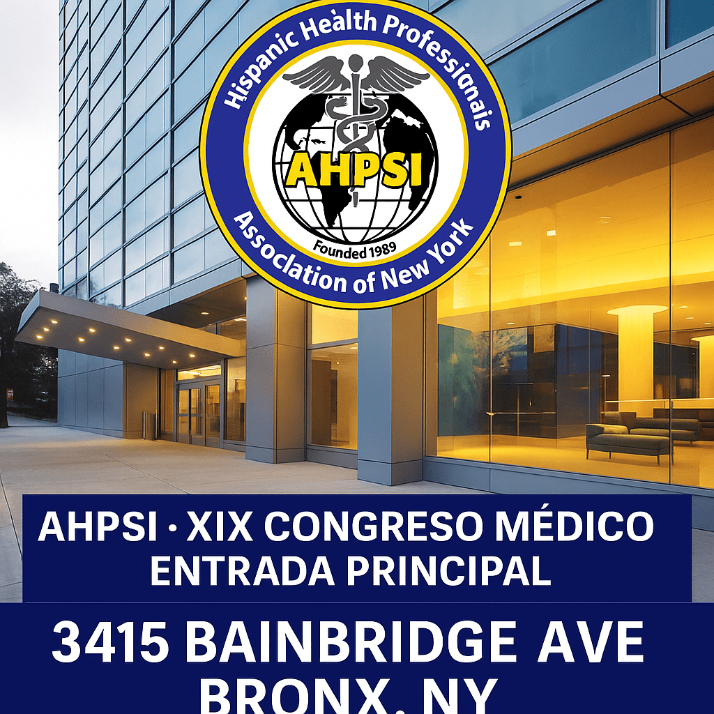 Por este medio, la Asociación Hispana de Profesionales de la Salud, Inc. NY (AHPSI) informa oficialmente que la entrada principal para el 19no Congreso Médico Internacional Multidisciplinario, los días sábado 17 y domingo 18 de mayo de 2025, será a través del: