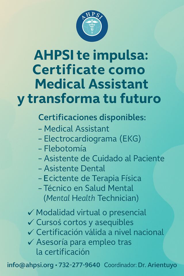 En la Asociación Hispana de Profesionales de la Salud, Inc. (AHPSI), creemos firmemente que el conocimiento abre puertas y que la formación profesional transforma vidas. Por eso, te invitamos a dar el siguiente paso en tu carrera con nuestra Certificación Nacional como Medical Assistant, una de las siete certificaciones que ofrecemos en un formato acelerado, práctico y accesible para todos los que desean integrarse al sistema de salud en los Estados Unidos.