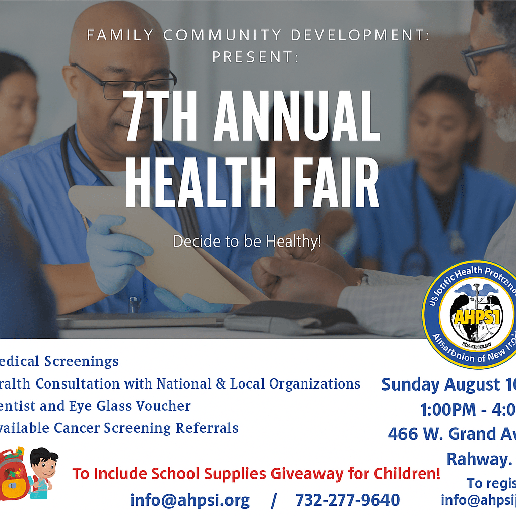 The Hispanic Health Professionals Association, Inc. NY (AHPSI) warmly invites all healthcare professionals to join us as volunteers at the 7th Annual Health Fair, organized by The Family Center, on Sunday, August 10, 2025, from 1:00 p.m. to 4:00 p.m., located at: