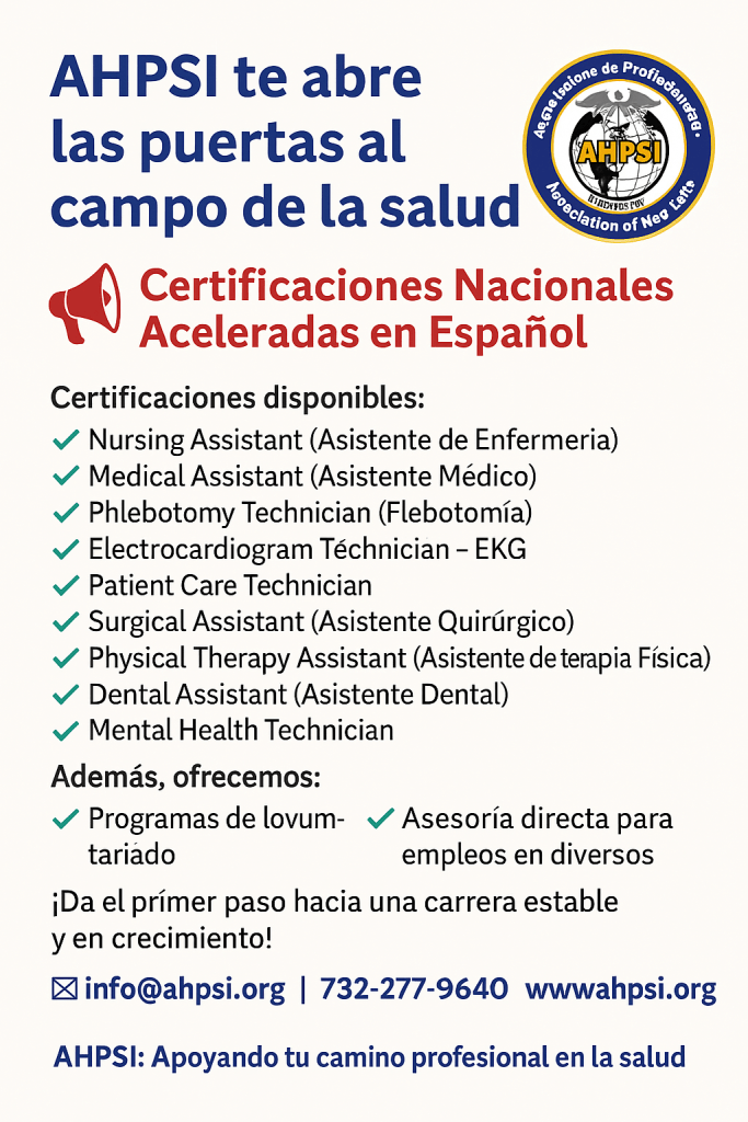 La Asociación Hispana de Profesionales de la Salud, Inc. NY (AHPSI) ofrece una variedad de certificaciones diseñadas para preparar a inmigrantes y profesionales hispanos que desean iniciar o avanzar en su carrera en el sector salud en los Estados Unidos.