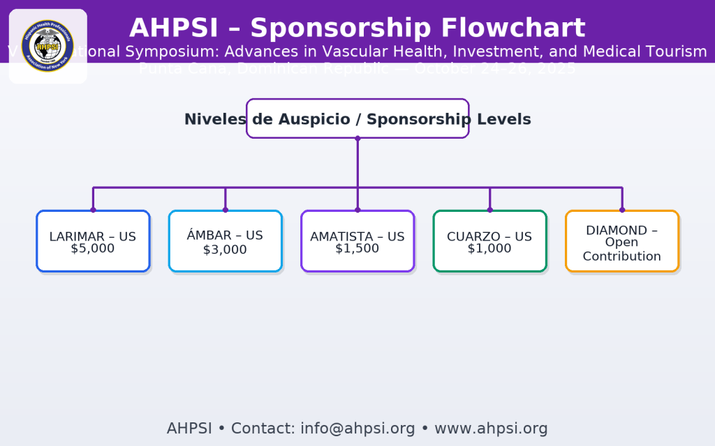 La Asociación Hispana de Profesionales de la Salud, Inc. (AHPSI) tiene el honor de invitarles al V Simposio Internacional: Avances en Salud Vascular, Inversión y Turismo Médico, a celebrarse del 24 al 26 de octubre de 2025 en el AC Hotel by Marriott Punta Cana, República Dominicana. Bajo el lema “Su Auspicio, Nuestra Misión: Salvar Vidas Juntos”, este encuentro marca el primer paso para establecer un programa nacional de prevención del accidente cerebrovascular en la República Dominicana.