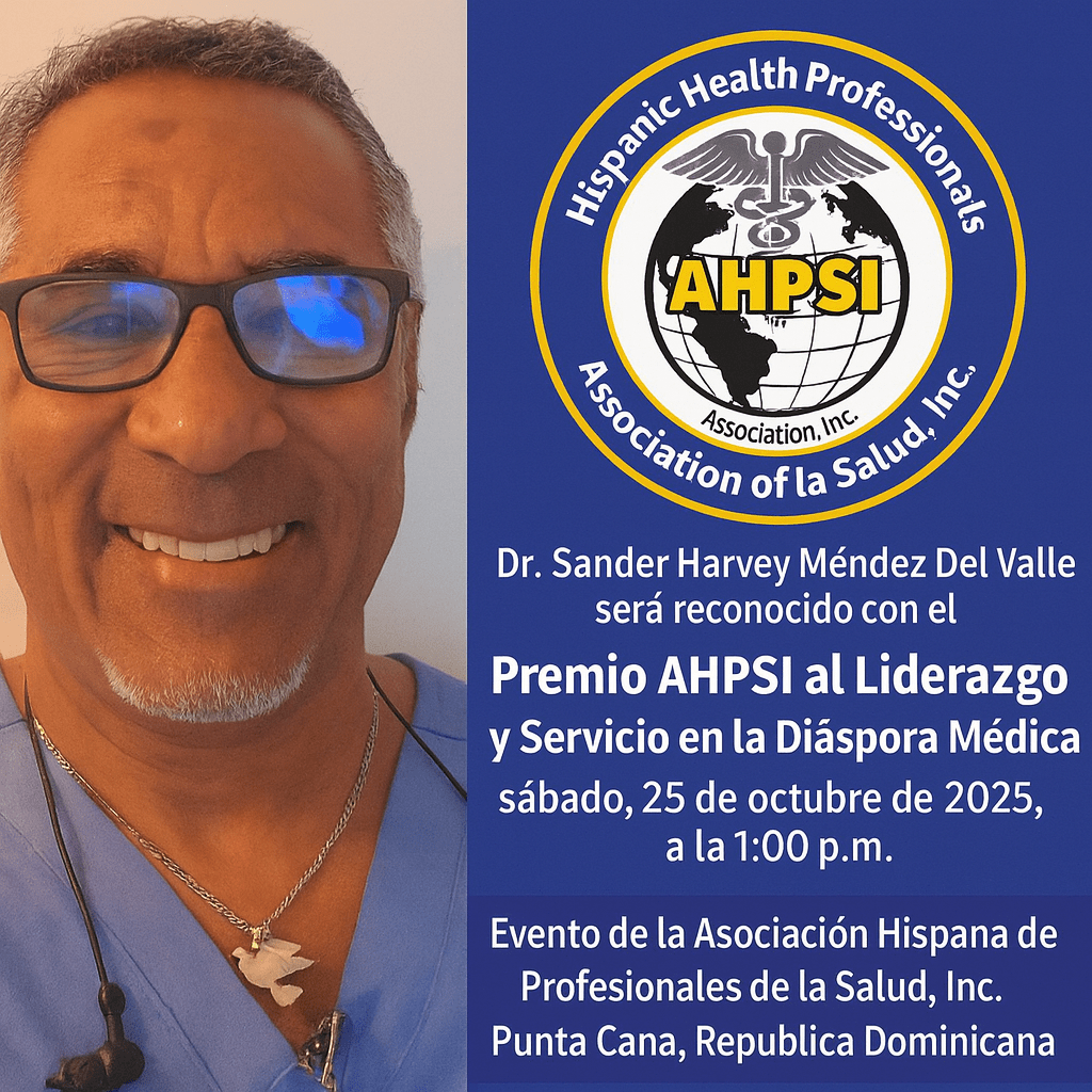 El Dr. Sander Harvey Méndez Del Valle será reconocido con el Premio AHPSI al Liderazgo y Servicio en la Diáspora Médica el sábado 25 de octubre de 2025 a la 1:00 p.m., en el marco del evento de la Asociación Hispana de Profesionales de la Salud, Inc. (AHPSI) en Punta Cana, República Dominicana.