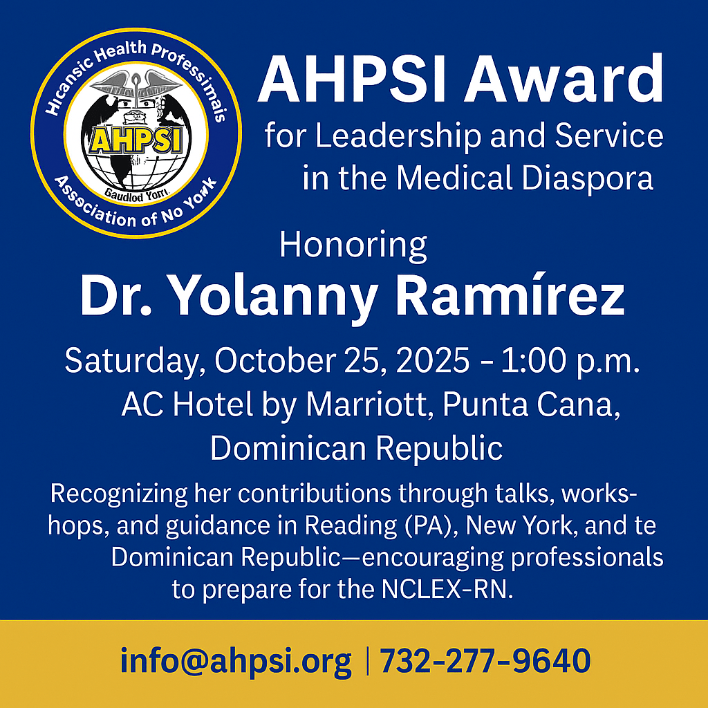 La Dra. Yolanny Ramírez será distinguida por su destacada labor formativa y de mentoría. En el marco de las actividades de AHPSI, ha impartido conferencias, talleres y orientación a profesionales de la salud en Reading (Pennsylvania), Nueva York y la República Dominicana, motivando de manera especial la preparación y presentación del examen NCLEX-RN como ruta de crecimiento