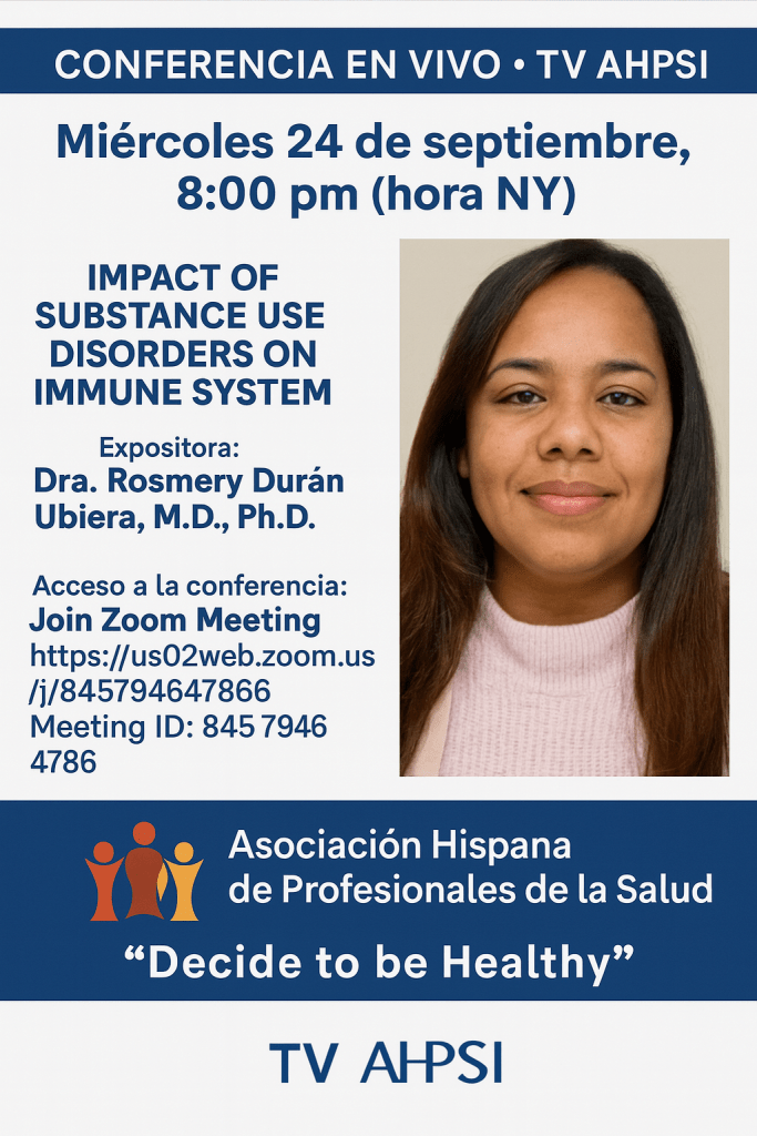 La Asociación Hispana de Profesionales de la Salud, Inc. NY (AHPSI) tiene el honor de invitarles a nuestra conferencia virtual este miércoles 24 de septiembre de 2025, a las 8:00 pm (hora NY), a través de nuestra plataforma Zoom.