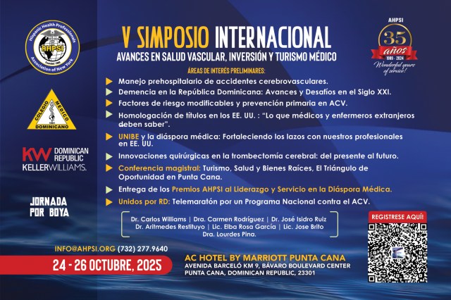 La Asociación Hispana de Profesionales de la Salud, Inc. (AHPSI) invita a toda la comunidad médica y científica al V Simposio Internacional: Avances en Salud Vascular, Inversión y Turismo Médico, que se celebrará del 24 al 26 de octubre de 2025 en el AC Hotel by Marriott Punta Cana, ubicado en Avenida Barceló Km 9, Bávaro Boulevard Center, Punta Cana, República Dominicana, 23301.