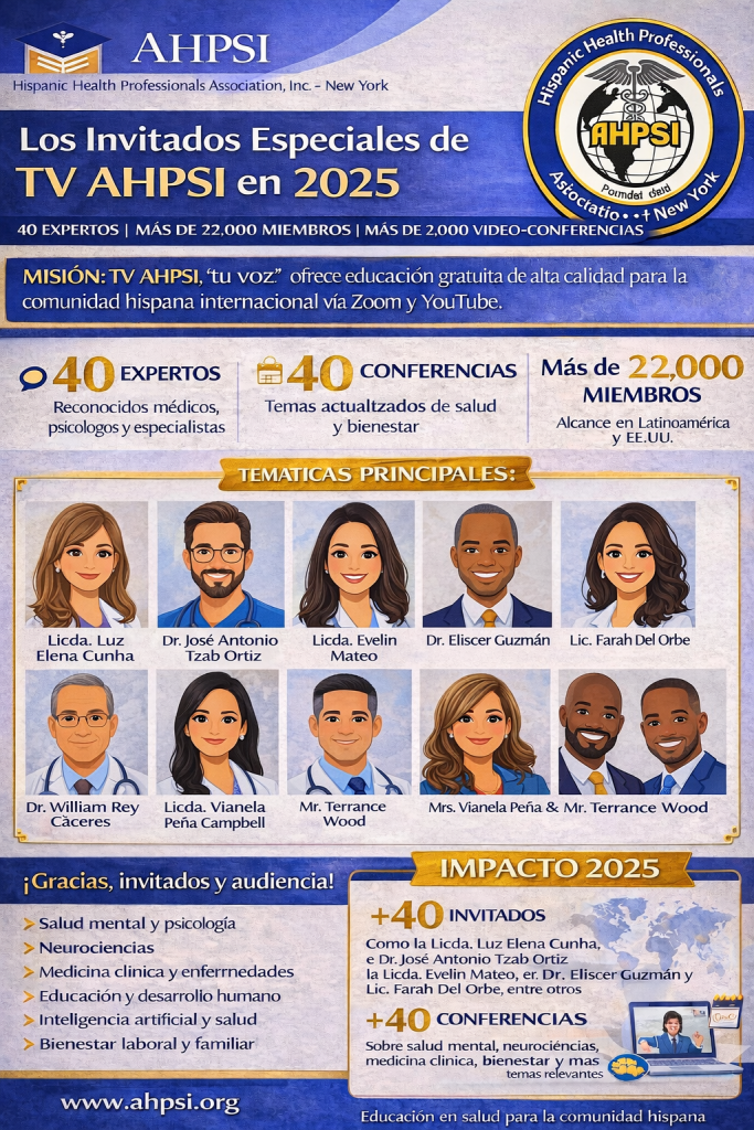 La Asociación Hispana de Profesionales de la Salud, Inc. – New York (AHPSI) presenta el presente Informe Ejecutivo, con el objetivo de documentar y destacar la labor educativa desarrollada a través de TV AHPSI durante el año 2025, consolidándose como una de las plataformas digitales de educación continua más activas y diversas dirigidas a profesionales de la salud y a la comunidad hispana en los Estados Unidos y otros países.