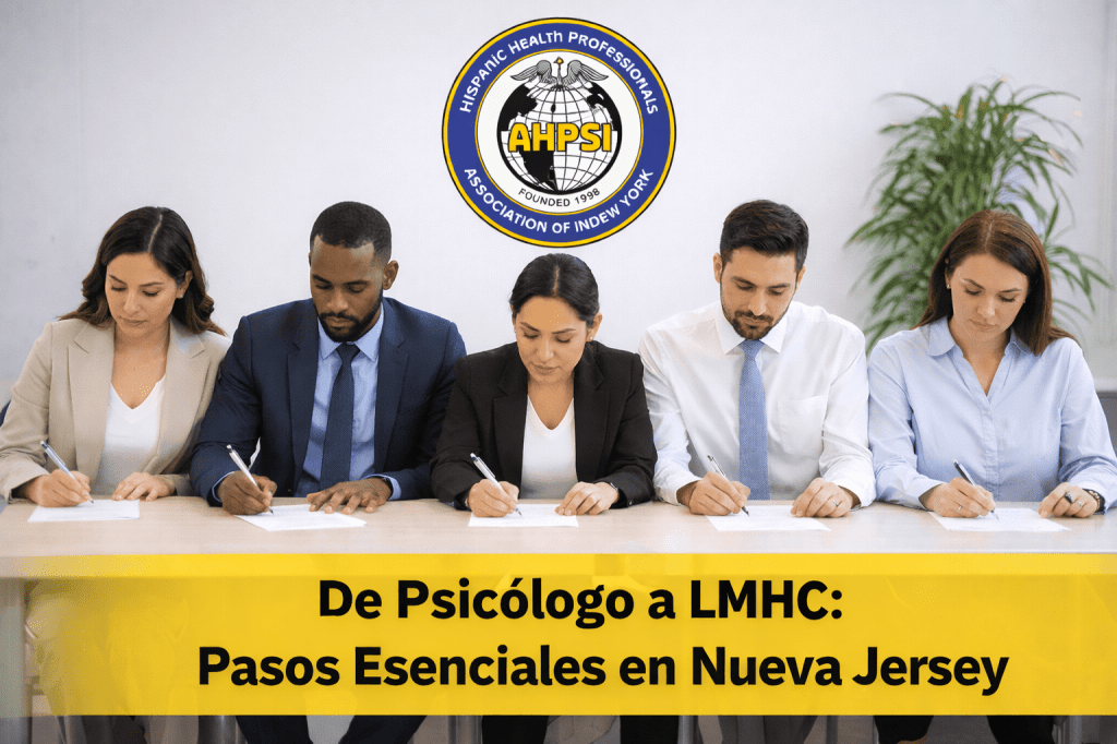 La Asociación Hispana de Profesionales de la Salud, Inc., New York (AHPSI) presenta este documento con el propósito de orientar a psicólogos graduados en América Latina —incluyendo profesionales de Ecuador, Perú, Colombia y la República Dominicana— que se encuentran en proceso de revalidación y obtención de la licencia LMHC en el estado de New Jersey.