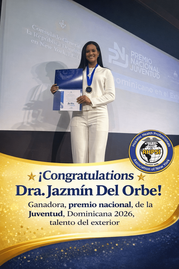 The Hispanic Health Professionals Association (AHPSI) proudly extends its warmest congratulations to Dr. Jazmín Del Orbe, recipient of the Dominican National Youth Award 2026, in the category “Talent from Abroad.”