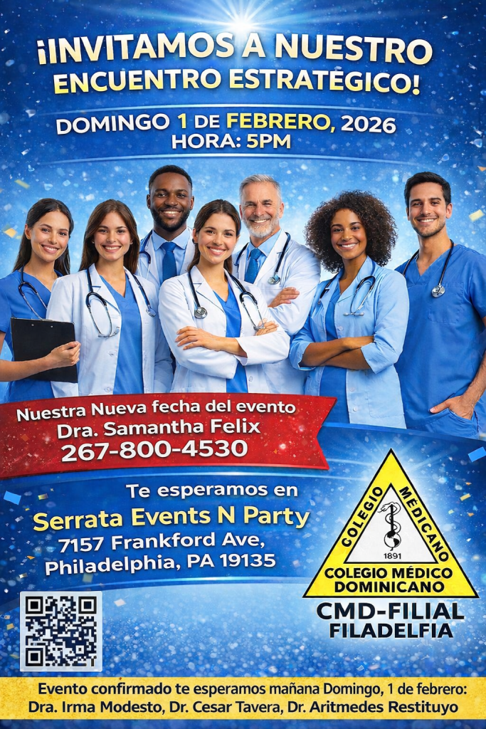 La Asociación Hispana de Profesionales de la Salud (AHPSI) y el Colegio Médico Dominicano, Filial Filadelfia, recuerdan a sus miembros y al público en general que el Encuentro Estratégico está confirmado para mañana, domingo 1 de febrero de 2026, a las 5:00 p.m.