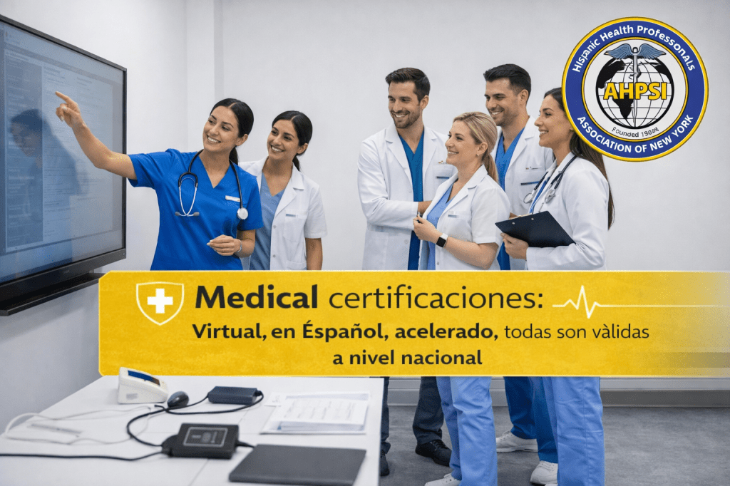 For over three decades, the Hispanic Health Professionals Association, Inc. (AHPSI) – New York has been committed to educating, guiding, and empowering the Hispanic community in the United States. Our mission is to provide practical, career-focused certification programs that prepare competent, ethical, and workforce-ready healthcare professionals.