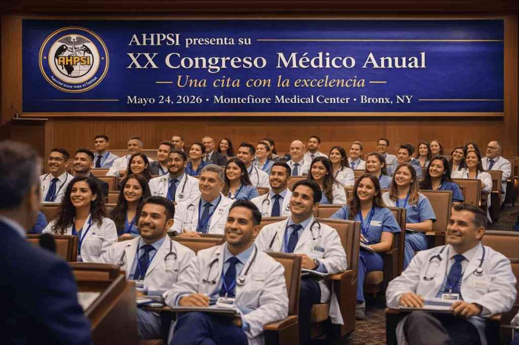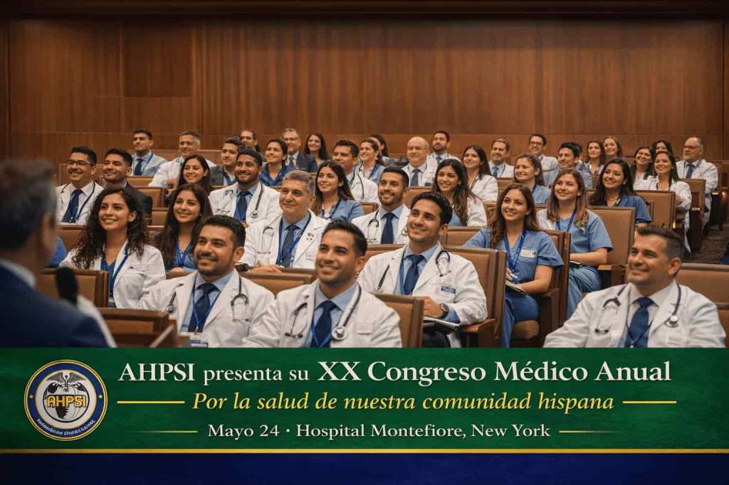 La Asociación Hispana de Profesionales de la Salud, Inc. (AHPSI) – New York invita a profesionales de la salud, estudiantes y público en general a su XX Congreso Médico Anual Internacional Multidisciplinario, el domingo 24 de mayo de 2026. Lugar: Montefiore Medical Center – Cherkasky Auditorium, 111 East 210th Street, Moses Division, Bronx, NY 10467. Hora: 7:30 a.m. a 4:30 p.m. Costo: US$50 profesionales | US$25 estudiantes. Información: 732-277-9640 | info@ahpsi.org.