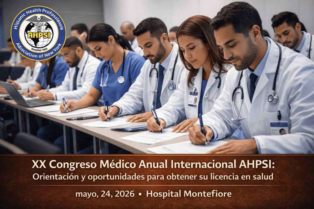 La Asociación Hispana de Profesionales de la Salud, Inc. (AHPSI) – New York, en el marco de sus 36 años de servicio y XX años realizando este importante encuentro académico, invita a sus miembros, profesionales de la salud, estudiantes y comunidad en general a participar en su XX Congreso Médico Anual Internacional Multidisciplinario, a celebrarse el domingo 24 de mayo de 2026, de 7:30 a.m. a 4:30 p.m., en el Montefiore Medical Center – Cherkasky Auditorium, 111 East 210th Street, Moses Division, Bronx, NY 10467.