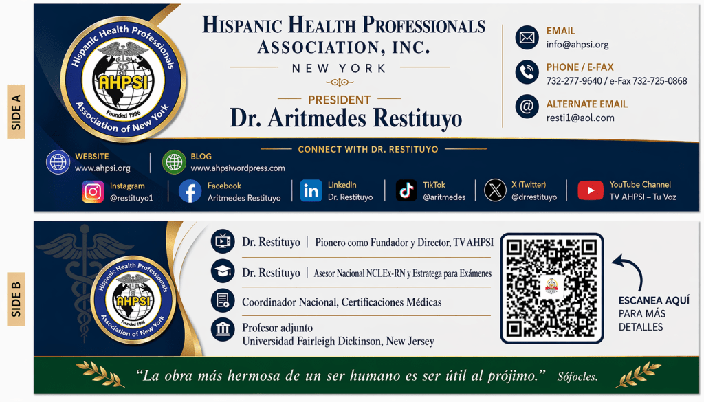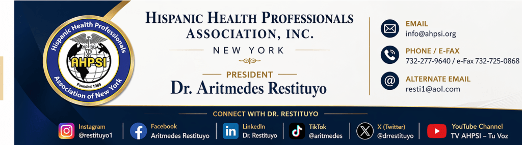 La Asociación Hispana de Profesionales de la Salud se complace en compartir los canales de comunicación directa de nuestro presidente, el Dr. Aritmedes Restituyo. A través de sus redes sociales, podrá mantenerse informado sobre las iniciativas de la asociación, eventos del sector y noticias relevantes para nuestra comunidad de profesionales de la salud.