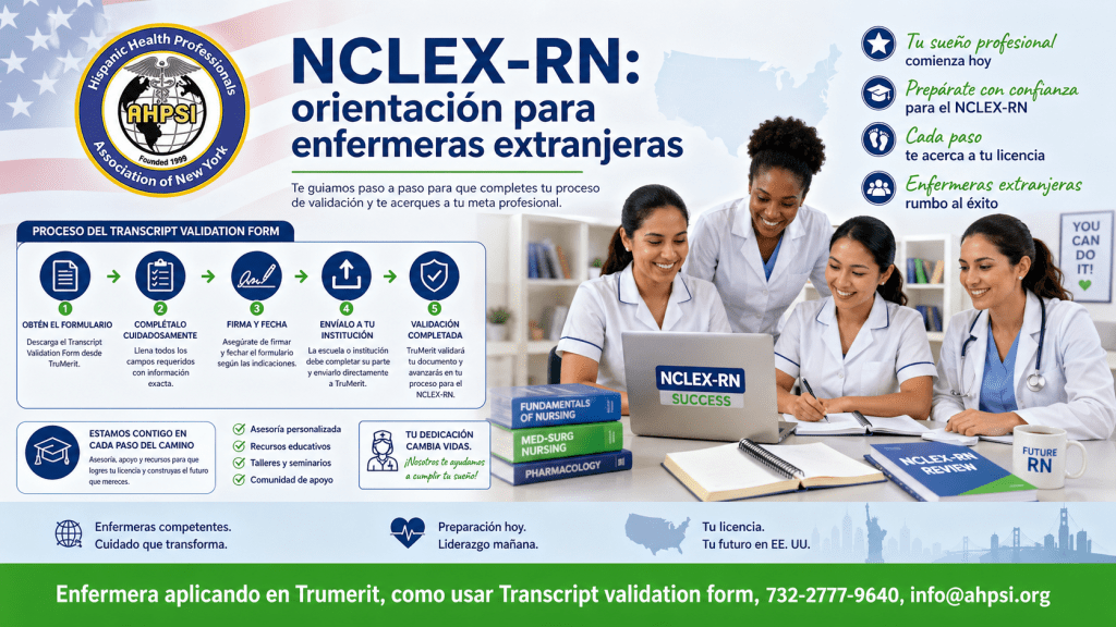 La Asociación Hispana de Profesionales de la Salud, Inc. NY (AHPSI), continúa orientando y acompañando a nuestras enfermeras graduadas en el extranjero en el proceso de llenar por primera vez su aplicación para presentar el examen NCLEX-RN, un paso fundamental para avanzar hacia la licencia de enfermería en los Estados Unidos.