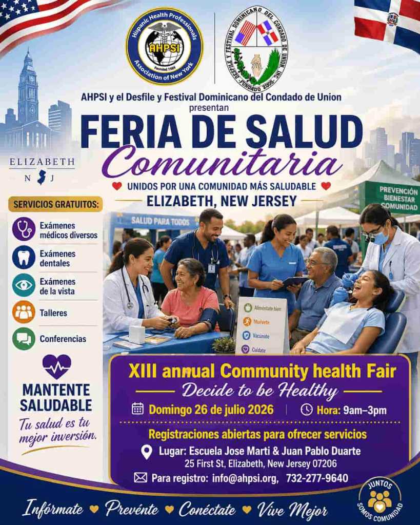 La Asociación Hispana de Profesionales de la Salud, Inc. NY (AHPSI), en coordinación con el Desfile y Festival Dominicano del Condado de Union, New Jersey, anuncia con entusiasmo la celebración de la XIII Feria Anual Comunitaria de la Salud “Decide to be Healthy / Decida ser saludable”, a realizarse el domingo 26 de julio de 2026, en la Escuela José Martí & Juan Pablo Duarte, ubicada en 25 First Street, Elizabeth, New Jersey 07206, en horario de 9:00 a.m. a 3:00 p.m.