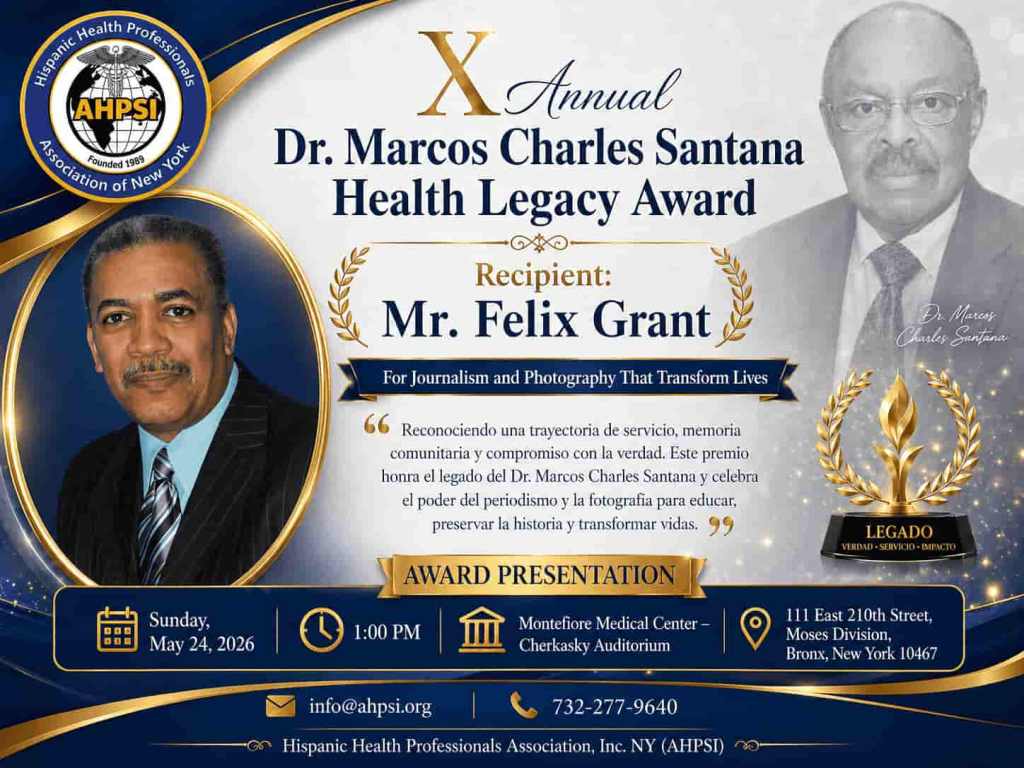 La Asociación Hispana de Profesionales de la Salud, Inc. NY (AHPSI), tiene el alto honor de anunciar que el distinguido periodista, comunicador, fotógrafo y editor dominicano Mr. Félix Grant ha sido seleccionado como recipiente del X Annual Dr. Marcos Charles Santana Health Legacy Award: For Journalism and Photography That Transform Lives.